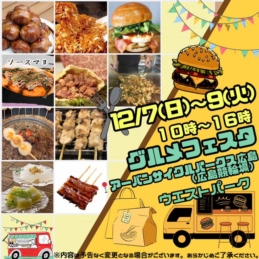2025年12月7日(日)~9日(火)の3日間、アーバンサイクルパークス広島(広島競輪場)にてグルメフェスタを開催します。
