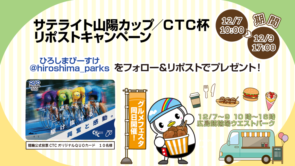 【広島競輪】12/7~12/9 サテライト山陽カップ/CTC杯開催! ←キャンペーン応募はこちら