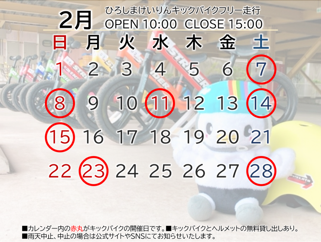 アーバンサイクルパークス広島「ウエストパーク」で開催しております、キックバイクフリー走行は悪天候のため中止とさせていただきます。