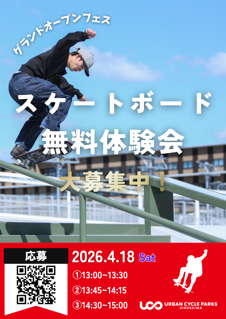 この度、アーバンサイクルパークス広島(広島競輪場)アーバンサイクルスポーツパークにて「スケートボード無料体験会を実施いたします。